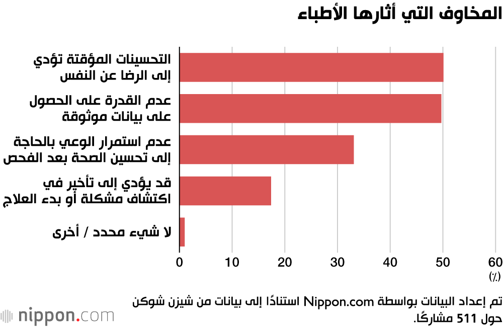 ومع ذلك، أثار الأطباء أيضًا مخاوف مُختلفة. وكان أكثر المخاوف شيوعًا، والتي ذكرها 50.1% و49.7% على التوالي، هو أنّ التحسن المؤقت قد يُؤدي إلى الرضا عن النفس، وأنّ الطاقم الطبي لن يكون قادرًا على الحصول على بيانات بناءً على نمط حياة الشخص الفعلي. وبينما يُمكن للتغييرات قصيرة المدى أن تُؤدي إلى نتائج أفضل، إلا أنها لن تُفيد الفرد. وشدّد العديد من الأطباء الذين شملهم الاستطلاع على أنّ الفحص الطبي يُنظر إليه كوسيلة لقياس نمط حياة الشخص الطبيعي.