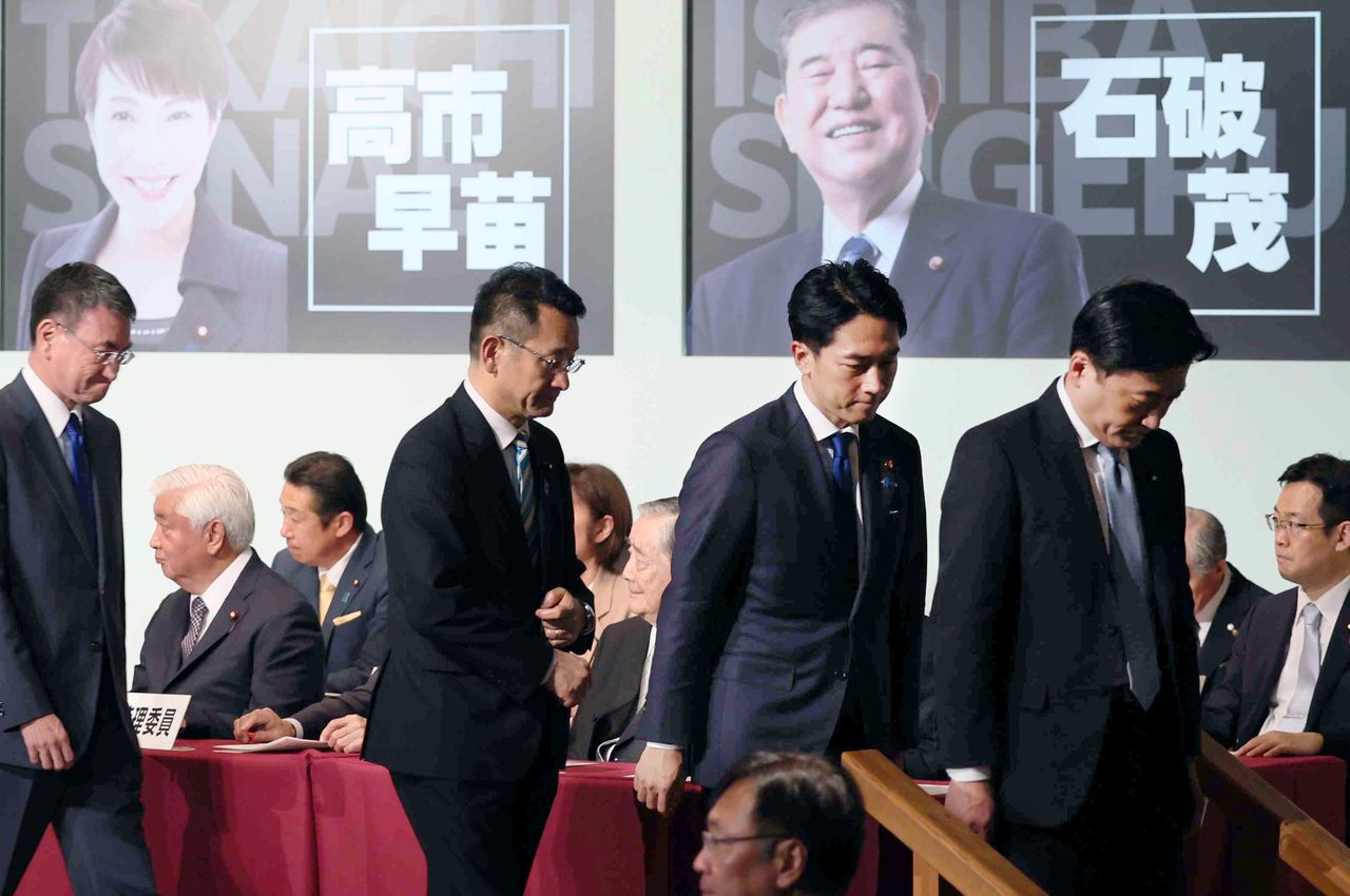 مرشحو انتخابات رئاسة الحزب لعام 2021 من اليسار: كونو تارو، الفائز النهائي كيشيدا فوميئو، تاكايتشي ساناي، نودا سييكو (© رويترز).