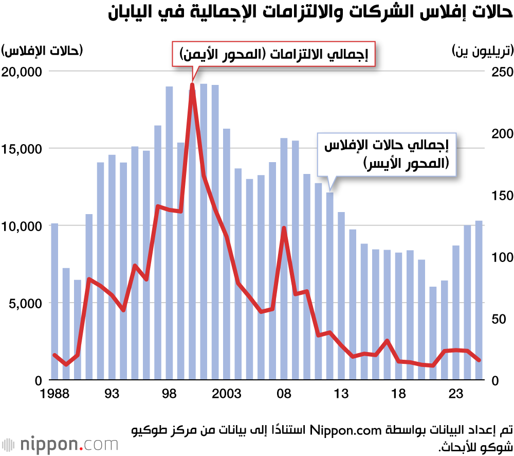 أظهر تقرير صادر عن مركز طوكيو شوكو للأبحاث أن عدد حالات إفلاس الشركات في اليابان، التي تتجاوز ديونها الإجمالية 10 ملايين ين، ارتفع بنسبة 2.9% على أساس سنوي في عام 2025 ليصل إلى 10300 حالة. وهذه هي السنة الثانية على التوالي التي يتجاوز فيها إجمالي حالات الإفلاس 10000 حالة. وشملت الشركات المفلسة شركة ”ألت“ المدرجة في البورصة، وهي شركة متخصصة في تطوير الذكاء الاصطناعي، وذلك بعد الكشف عن مخالفات محاسبية. ومع ذلك، انخفض إجمالي الديون بنسبة 32% ليصل إلى 1.6 تريليون ين، حيث شملت العديد من حالات الإفلاس شركات صغيرة جداً بديون تقل عن 100 مليون ين. وهذه هي المرة الأولى منذ أربع سنوات التي ينخفض فيها إجمالي الديون إلى أقل من 2 تريليون ين.