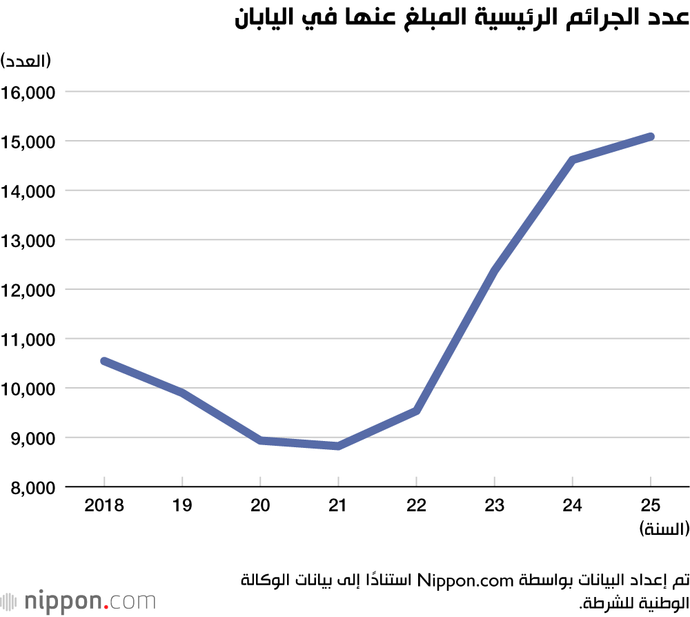ارتفع عدد الجرائم المُبلّغ عنها في اليابان بنسبة 4.9% في عام 2025 ليصل إلى 774,142 جريمة، وفقًا لإحصاءات وكالة الشرطة الوطنية. وهذا الرقم أعلى من إجمالي عام 2019، قبل جائحة كورونا.