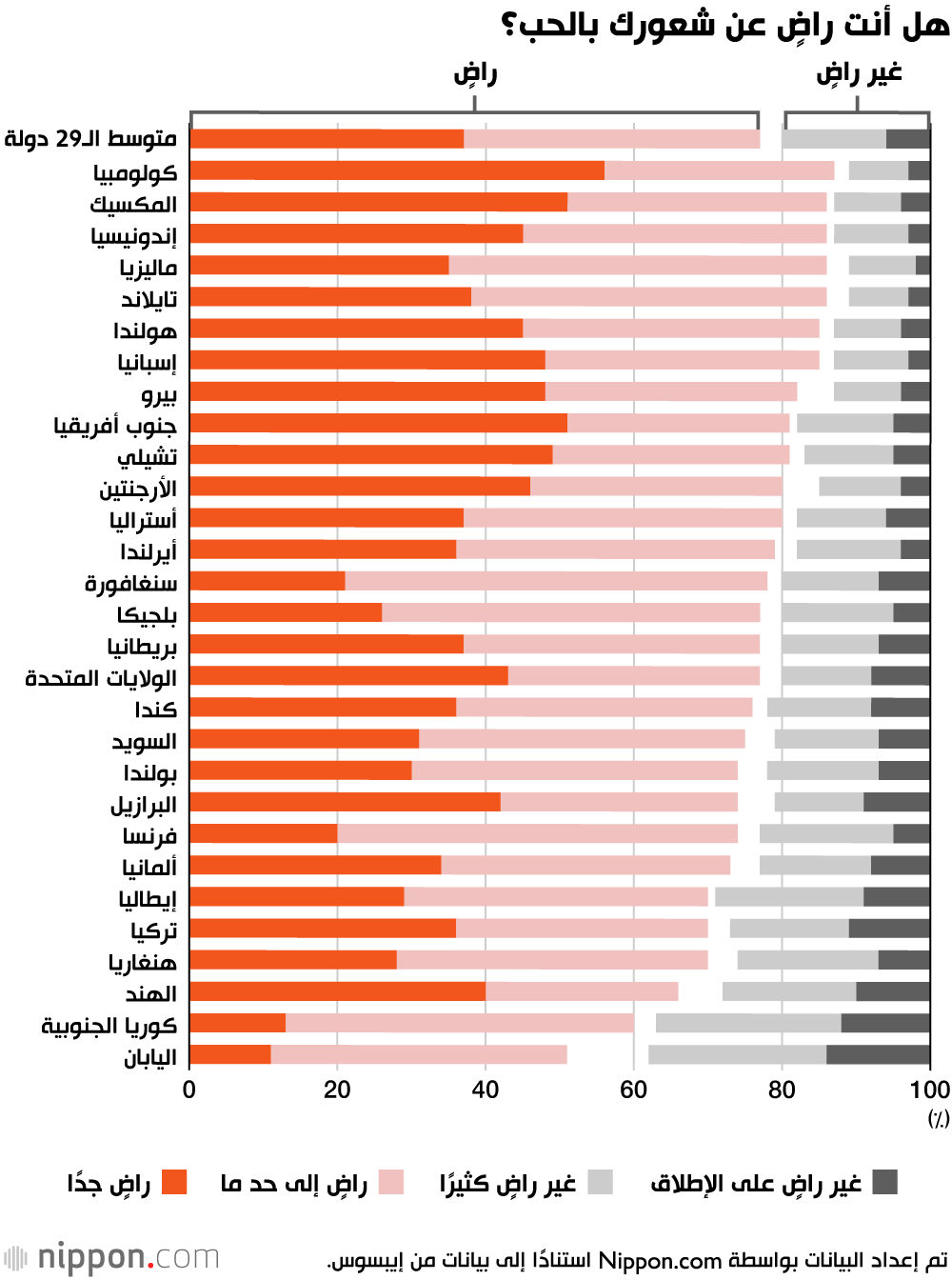 أجرت شركة الاستطلاعات الدولية إيبسوس (Ipsos) مقرها باريس استطلاعًا حول المواقف تجاه العلاقات الرومانسية، وشمل 23268 شخصًا من 29 دولة. احتلت اليابان المرتبة الأخيرة في فئة «الشعور بالحب»، حيث قال 51% فقط من المستجيبين اليابانيين إنهم يشعرون برضا كبير أو متوسط في هذا الجانب. وهذه النسبة أقل بكثير من المتوسط العام للـ29 دولة الذي بلغ 77%.