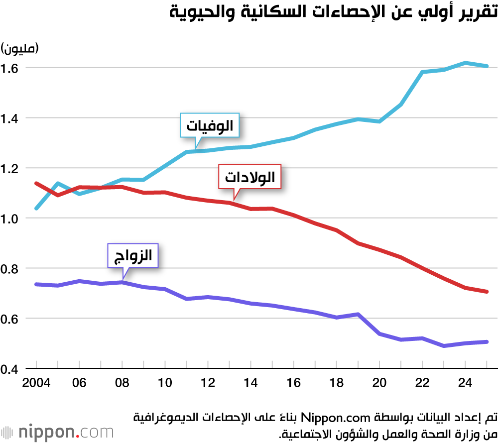 تم إعداد البيانات بواسطة Nippon.com استناداً إلى الإحصاءات الديموغرافية الصادرة عن وزارة الصحة والعمل والشؤون الاجتماعية. وتُعدّ إحصاءات عامي 2024 و2025 تقديرات أولية.