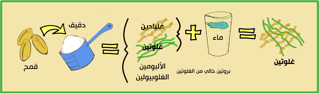 يشكل ارتباط الماء ببروتينات الغليادين والجلوتينين في دقيق القمح مركبًا بروتينيًا كبيرًا يسمى الغلوتين، يوجد في القمح والشعير والجاودار وأحيانًا في الشوفان. يرتبط هذا البروتين المعقد بنفسه ويشكل شبكة منتظمة ومستمرة من الخيوط الدقيقة، مما يسمح لدقيق القمح بالالتصاق ببعضه البعض لالتقاط فقاعات الهواء التي تخلق النسيج الرغوي للخبز. لكن هذا ليس كل شيء، فالغلوتين مرن للغاية ويمكنه أن يمتص ضعف وزنه في الماء. كل هذه الخصائص، امتصاص الماء والالتصاق واللدونة، تجعله ذا قيمة خيالية في صناعة المواد الغذائية خاصةً في منتجات مثل الزبدة والآيس كريم، ويمكن استخدامه لإطالة الحجم وخلق قوام ناعم. يُستخدم دقيق القمح بشكل شائع في عملية تجميد الأطعمة الجاهزة التي تحتوي على الأرز لمنع الحبوب من التكتل، وكمادة رابطة وموسعة في منتجات اللحوم المصنعة، وكمكثف أو عامل تلوين في الصلصات، بل إن الغلوتين موجود حتى في بعض منتجات التجميل والعناية بالبشرة. تُعد مُحلّيات العصائر المصنوعة من الشعير طريقة غير مُصنَّفة تمامًا لمواجهة انتشار الغلوتين في اليابان.