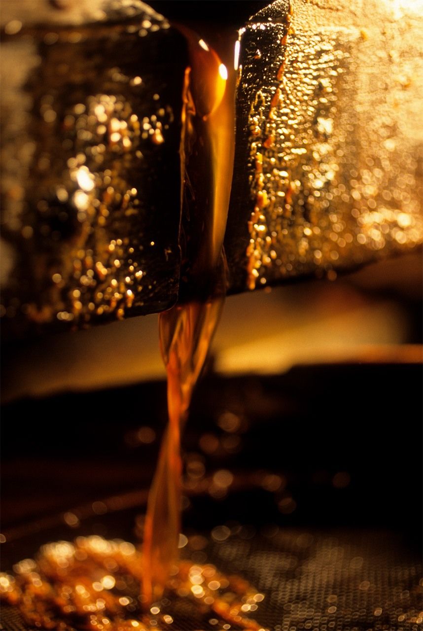 في نهاية عملية التخمير يكبس الخليط لجمع صلصة الصويا الخام.