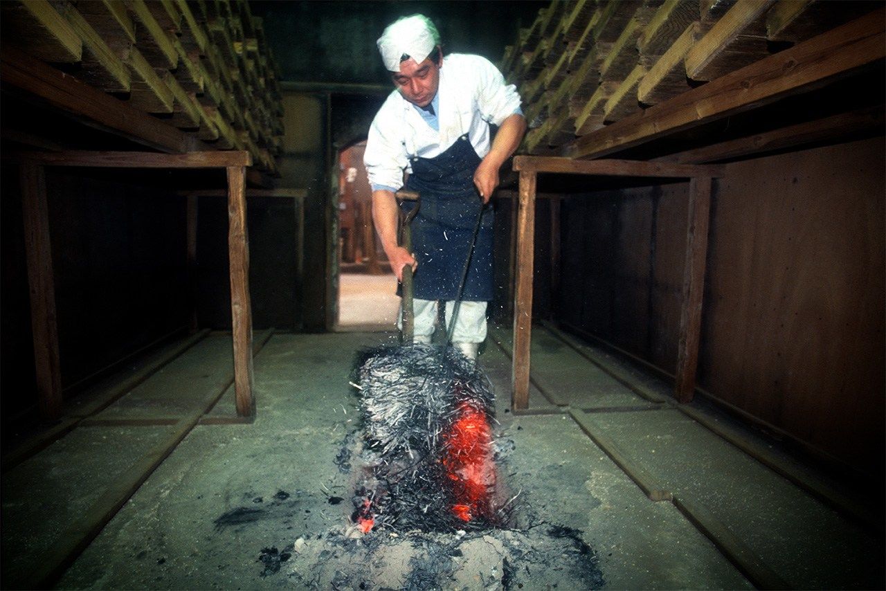 عامل يغطي جمرات متوهجة برماد قش لتسخين غرفة كوجي مورو.