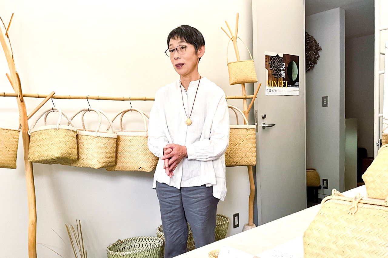 تتراوح إبداعات شيباتا من العناصر التقليدية مثل سلال تخزين الكوري (على اليسار) إلى حقائب اليد العصرية المستوحاة من عناصر “نمط M ” المنتجة للتصدير في ماتسوموتو، محافظة ناغانو، قبل قرن من الزمان. (© أريموتو يايوي)
