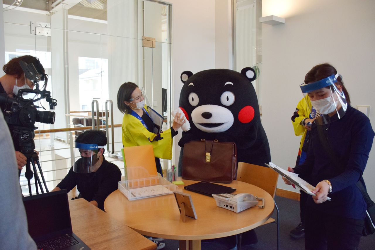 كومامون يزور الأطفال في حضانة في نيشيهارا في مايو / أيار عام 2016 بعد سلسلة من الزلازل في كوماموتوأثرت بشدة على المنطقة. ”الصورة بإذن من محافظة كوماموتو“.