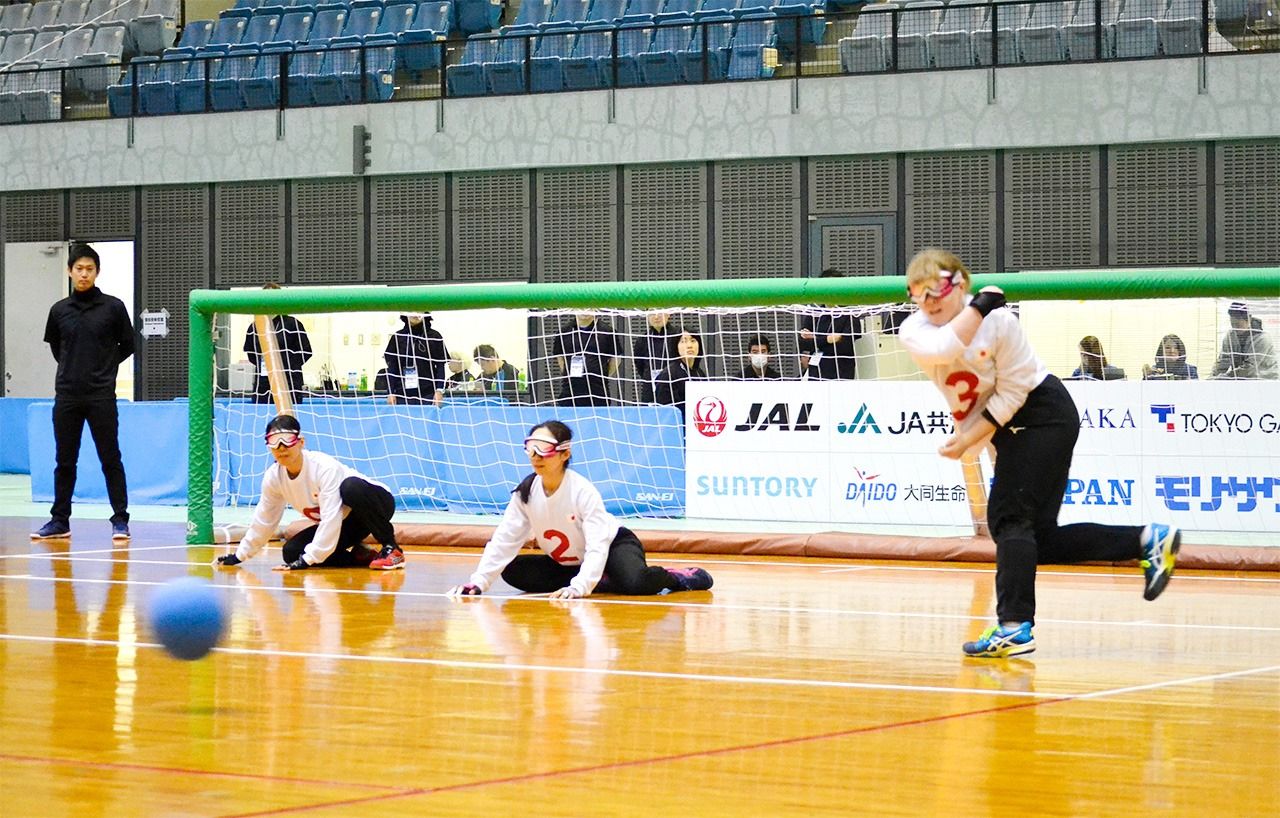 المنتحب الوطني للسيدات من اليسار إلى اليمين: كوميا مساي، أوراتا ري، كاكيهاتا إيكو خلال إحدى مباريات بطولة اليابان لكرة الهدف للمكفوفين التي جرت في فبراير/شباط 2019. جيجي برس.