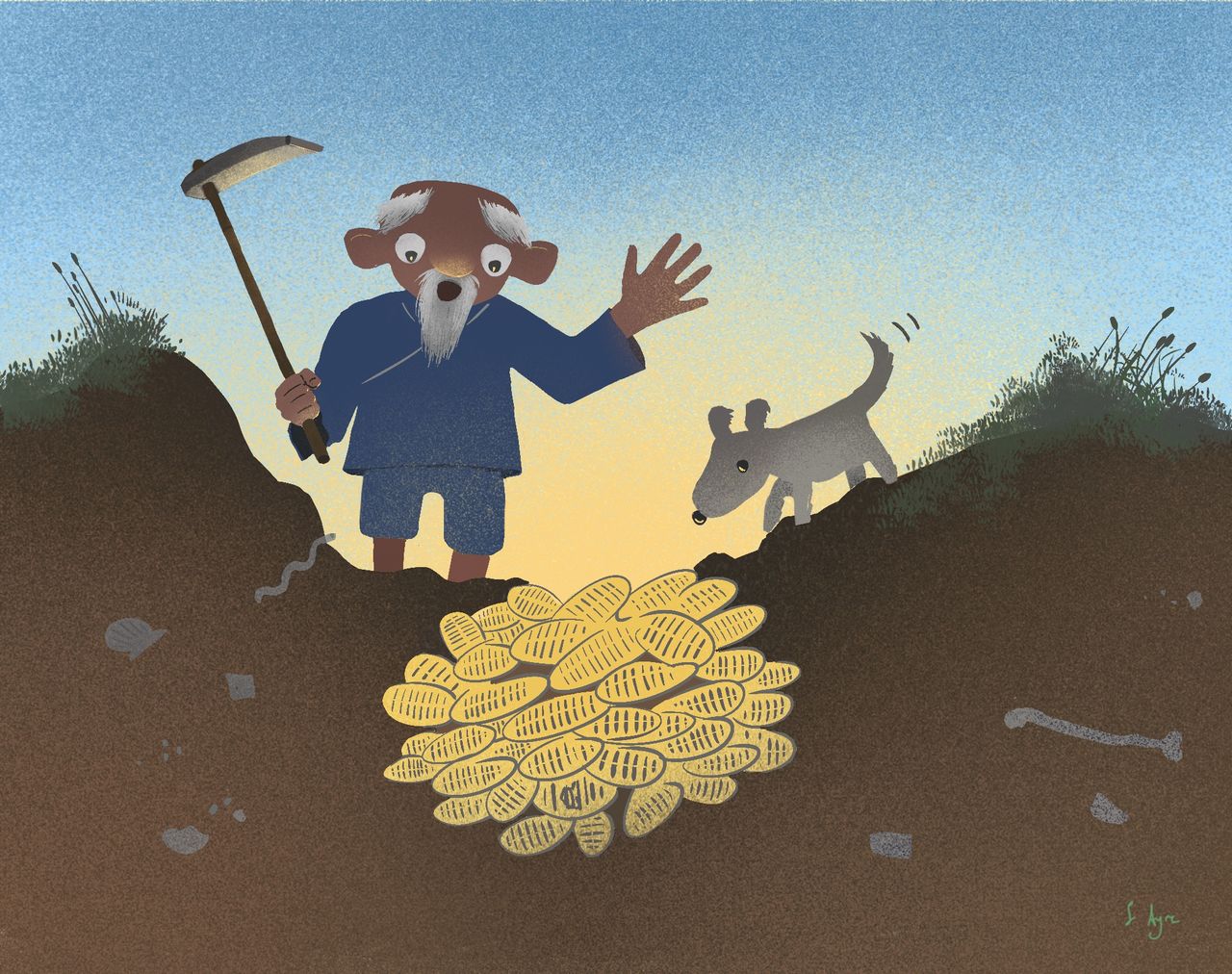 وفي أحد الأيام، بينما كان الرجل العجوز يحرث حقله، بدأ شيرو ينبح بحماس أكثر من المعتاد. ثم ركض الكلب في دائرة، يشم وينبش الأرض. مسح العجوز العرق عن جبهته واقترب من الكلب المتحمس الذي بدا وكأنه يحثه على الحفر. وبدأ بضرب فأسه في الأرض، وسرعان ما اصطدم بشيء قوي. ولدهشته، اكتشف عشرات العملات الذهبية.