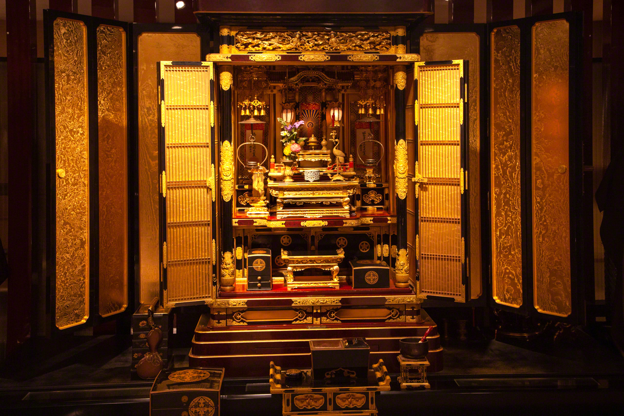 المظهر الخارجي والداخلي لـ ”البوتسودان الذهبي“ الذي قام متجر عريق لبيع البوتسودان في كيوتو بجمع أفضل مهارات نحاتي التماثيل البوذية وتصميمه في عصر ميجي بناءً على طلب صاحب منجم فحم في فوكوكا. تم استخدام نبات الزلكوفا النقية بشكل فاخر، وتم طلاؤه بالورنيش وتغطيته بالورق المُذهَّب، ويُعبِّر عن أرض الجنة الطاهرة (التعاون في التصوير: متجر هاسيغاوا للبوتسودان، صالة العرض في متجر جينزا الرئيسي)
