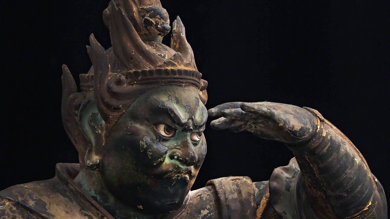 هذا التمثال يجسد أحد الجنرالات السماويين الاثني عشر، وهو من حراس الشرف يحمي ”ياكوشي نيوراي (بهيساجياجورو) وهو ”بوذا الطب“ الذي يشفي من كل معاناة. عيناه المتيقظتان على الدوام تتلألآن بإخلاص عاطفي لبوذا وتصميم على حماية الدارما من أعدائها. إلى ماذا يحدق هذا التمثال بهذه الحدة؟