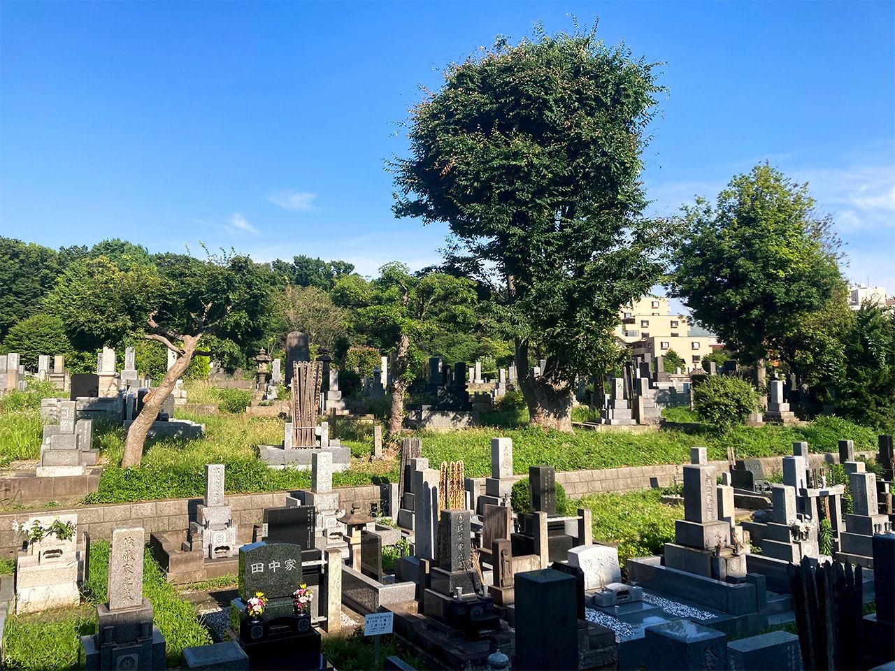 تقع مقبرة ”توكايجي أوياما“ التي يعود تاريخها لقرون بين محطتي أوساكي وشيناغاوا، محشورة بين خطوط الشينكانسن وخط يامانوتي وخطوط كييكيو. (© غياني سيمون)