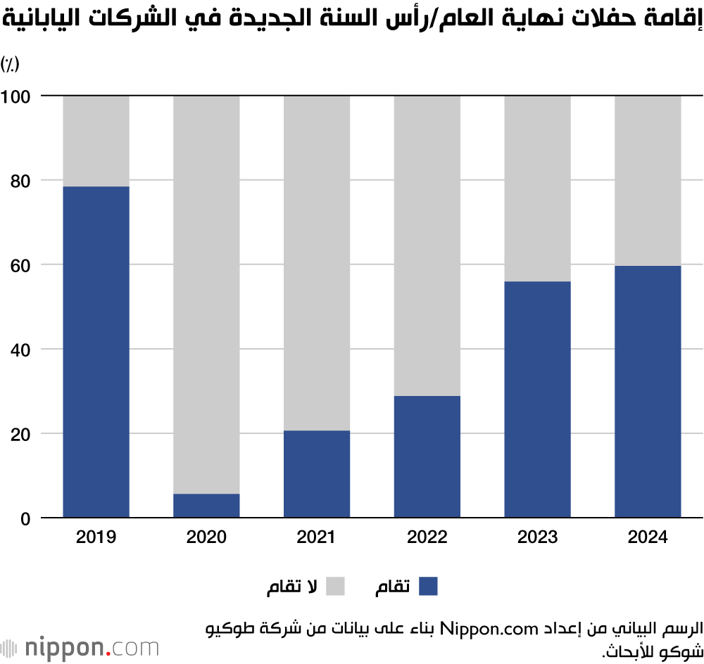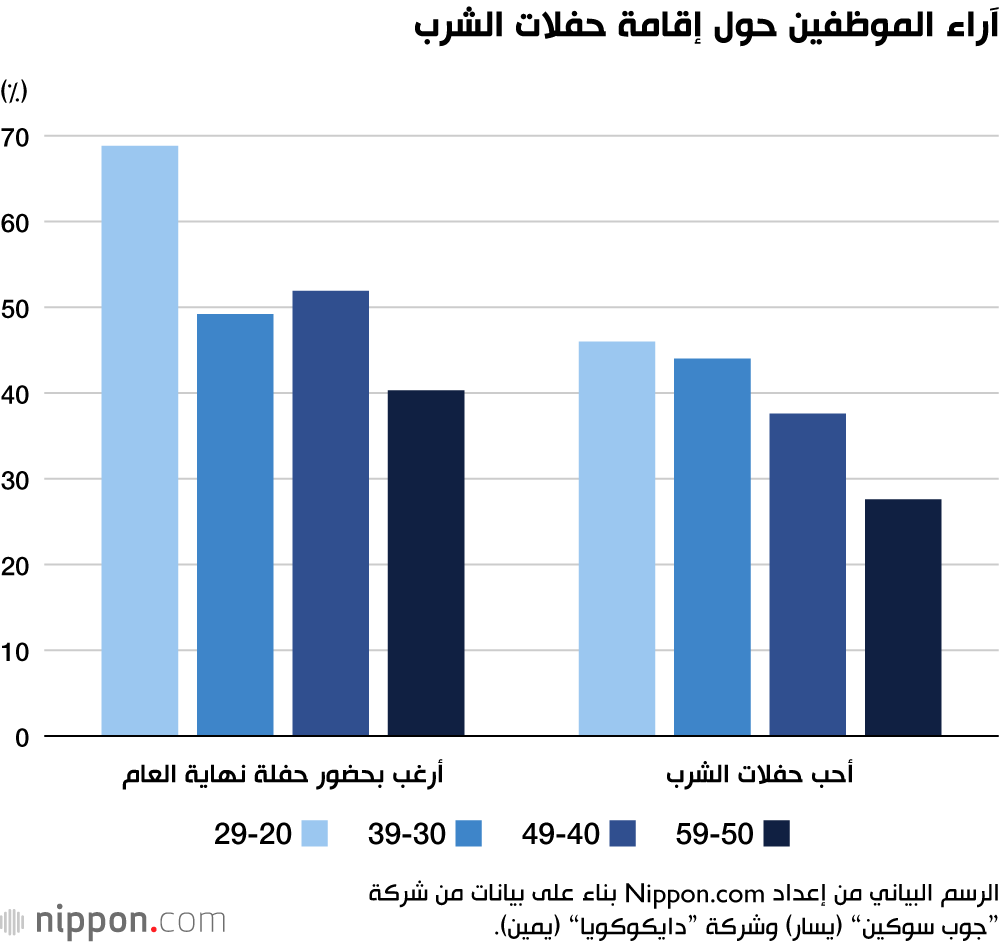 ولكن تشهد هذه الثقافة المؤسسية تغيرا سريعا. فقد أظهر استطلاع أجرته شركة طوكيو شوكو للأبحاث في عام 2024 أن 59.6% فقط من الشركات أقامت حفلات نهاية العام أو بداية السنة الجديدة، وهو ما يقل بنحو 20 نقطة مئوية مقارنة بعام 2019، أي قبل انتشار جائحة كوفيد-19. وتعزى الأسباب وراء ذلك إلى انخفاض الطلب وتزايد تعبير الموظفين عن معارضتهم، ما يعني أن حفلات الشرب لم تستعد مكانتها السابقة حتى بعد رفع القيود المرتبطة بالجائحة.