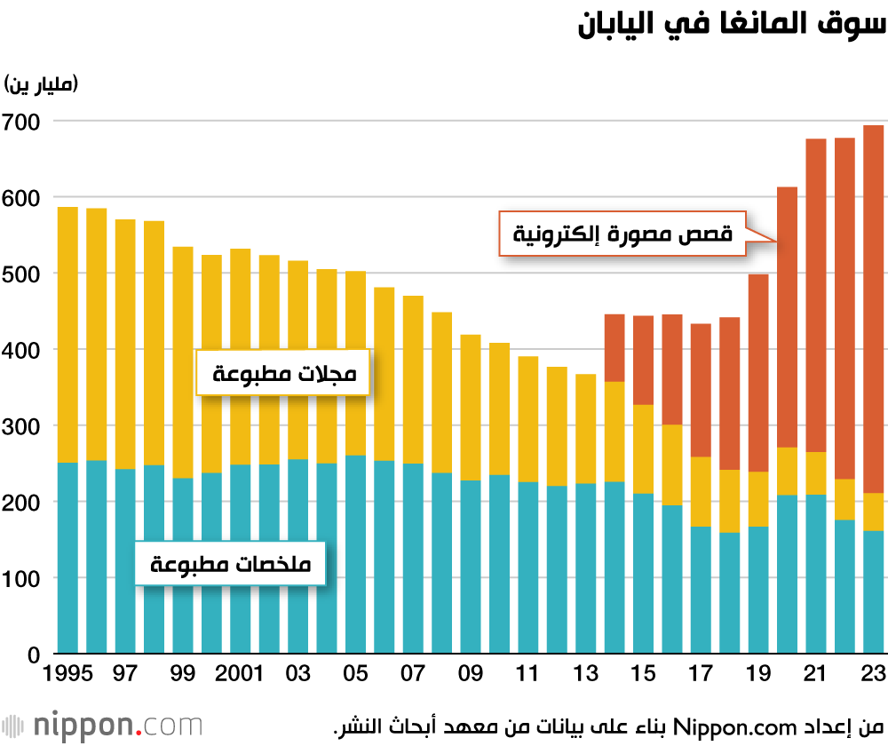 تُظهر البيانات التي ينشرها معهد أبحاث النشر في فبراير/شباط من كل عام، أن مبيعات المجلات المطبوعة في عام 2014 كانت نحو 131.3 مليار ين ومبيعات الملخصات المطبوعة (تانكوبون) كانت نحو 225.6 مليار ين ومبيعات القصص المصورة الإلكترونية كانت نحو 88.7 مليار ين. ولكن في عام 2023، انخفضت مبيعات المجلات المطبوعة لأكثر من النصف إلى 49.7 مليار ين، وانخفضت مبيعات الملخصات المطبوعة بنحو الثلث إلى 161 مليار ين، بانخفاض إجمالي في المبيعات المطبوعة يصل إلى حوالي 40%. وفي المقابل، ازدادت مبيعات القصص المصورة الإلكترونية بأكثر من 5 مرات لتصل إلى 483 مليار ين.