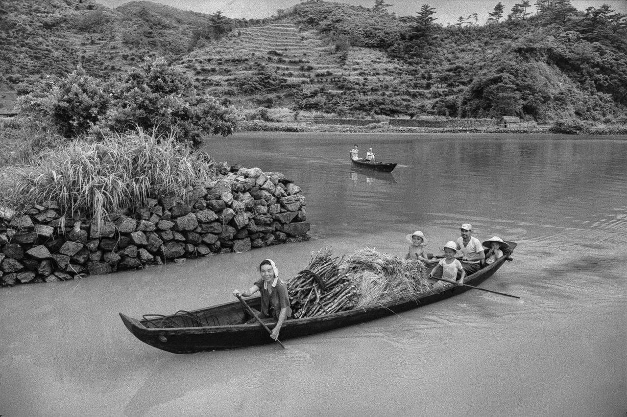 في سنوات ما بعد الحرب، كانت الأنهار الوسيلة الرئيسية للمواصلات في قرية أوكين. والأطفال كانوا يساعدون أيضًا في حصاد الأرز. (الصورتان العلوية والسفلية اليسرى © هاغا هيدييو؛ الصورة السفلية اليمنى © Nippon.com)