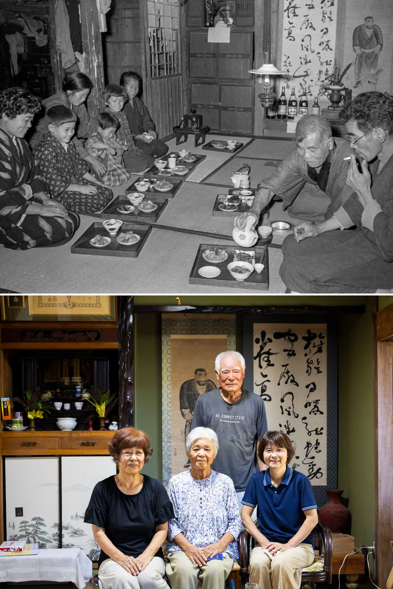 احتفال برأس السنة آنذاك، وأفراد العائلة الآن. (الصورة العلوية © هاغا هيدييو؛ الصورة السفلية © Nippon.com)