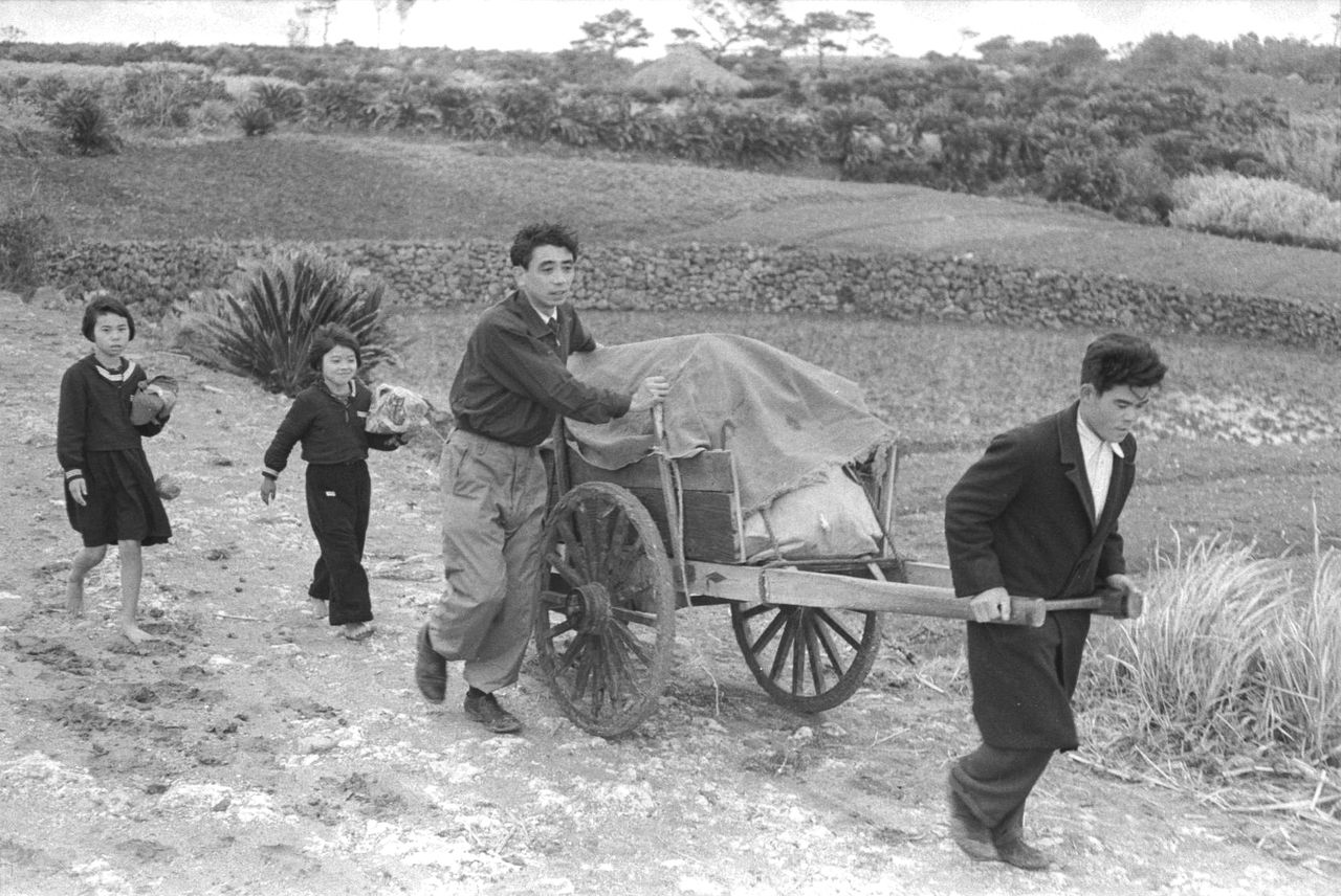 هاغا هيدييو (في الوسط) يساعد في دفع عربة محملة بالأغراض في جزيرة أوكينويرابوجيما. (© هاغا هيدييو)
