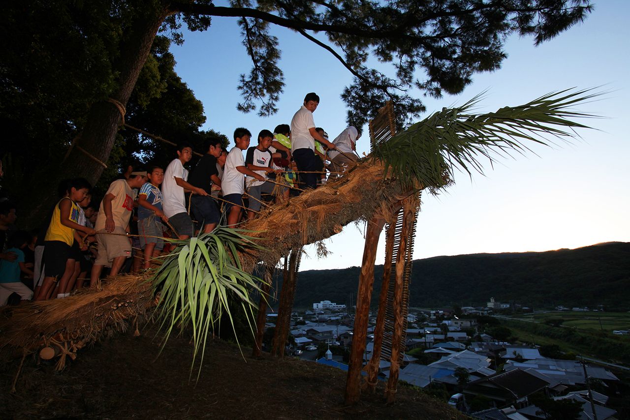 يُعدّ حي أكينا في بلدة تاتسوغو واحد من الأحياء القليلة في جزيرة أمامي أوشيما الذي لا يزال يزرع الأرز. ويُعتبر مشهد شوتشوغاما، حيث يطيء رجال الحي بأقدامهم على كوخ مسقوف بالقش، من أبرز المشاهدات الطقسية المحلية المقامة للدعاء من أجل حصاد وفير. ويعرف هذا الطقس باسم أكينا أراسيتسو، الذي يُقام في الشهر الثامن وفقًا للتقويم القمري الشمسي. (© هامادا فوتوشي)