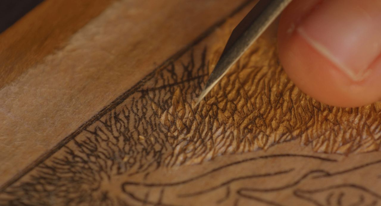 يعمل أحد الحرفيين المعاصرين في مشروع إعادة إنتاج لوحات الشونغا وتكرار التقنيات الأصلية لصانعي المطبوعات الأصلية (© لجنة إنتاج شونغا 2023)