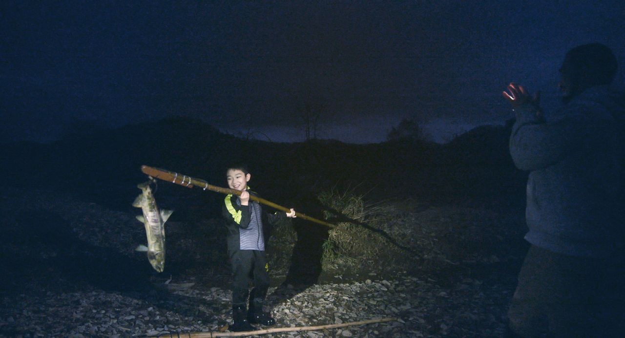 موتوكي يرفع السمكة التي صادها باستخدام الماريب (© 2024 لجنة إنتاج فيلم أينو بورى/حقوق الطبع والنشر تاكيشي فوكوناغا)