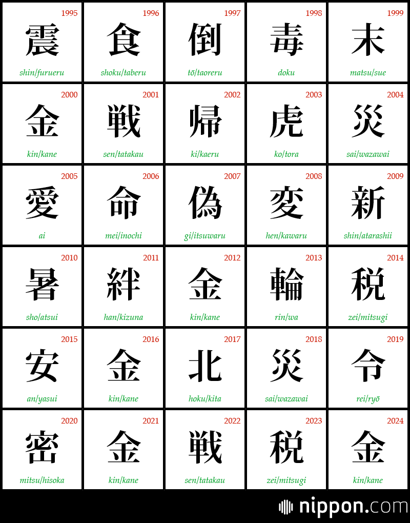 وهذه هي المرة الخامسة في تاريخ المسابقة التي بدأت في عام 1995، يفوز فيها هذا الكانجي بالمرتبة الأولى. وفي كل مرة يتم اختياره فيها، كان العام يوافق سنة ألعاب أولمبية صيفية، ولم يكن عام 2024 استثناء. ولكن إلى جانب ربط الكثير من المصوتين هذا الكانجي بالميداليات الذهبية، نال الحرف أيضا أكبر عدد من الأصوات هذا العام بسبب ارتباطه بالمال، ولا سيما الأموال المجموعة بشكل غير مشروع والتي أثرت بشدة على الحزب الليبرالي الديمقراطي الحاكم جراء الفضيحة السياسية التي كلفته كثيرا من مقاعده في الانتخابات العامة في أكتوبر/تشرين الأول، بالإضافة إلى الرغبة في كسب أموال بسرعة ما دفع الكثيرين إلى البحث عن ”وظائف مظلمة بدوام جزئي“ والتي أصبحت ظاهرة اجتماعية في عام 2024.