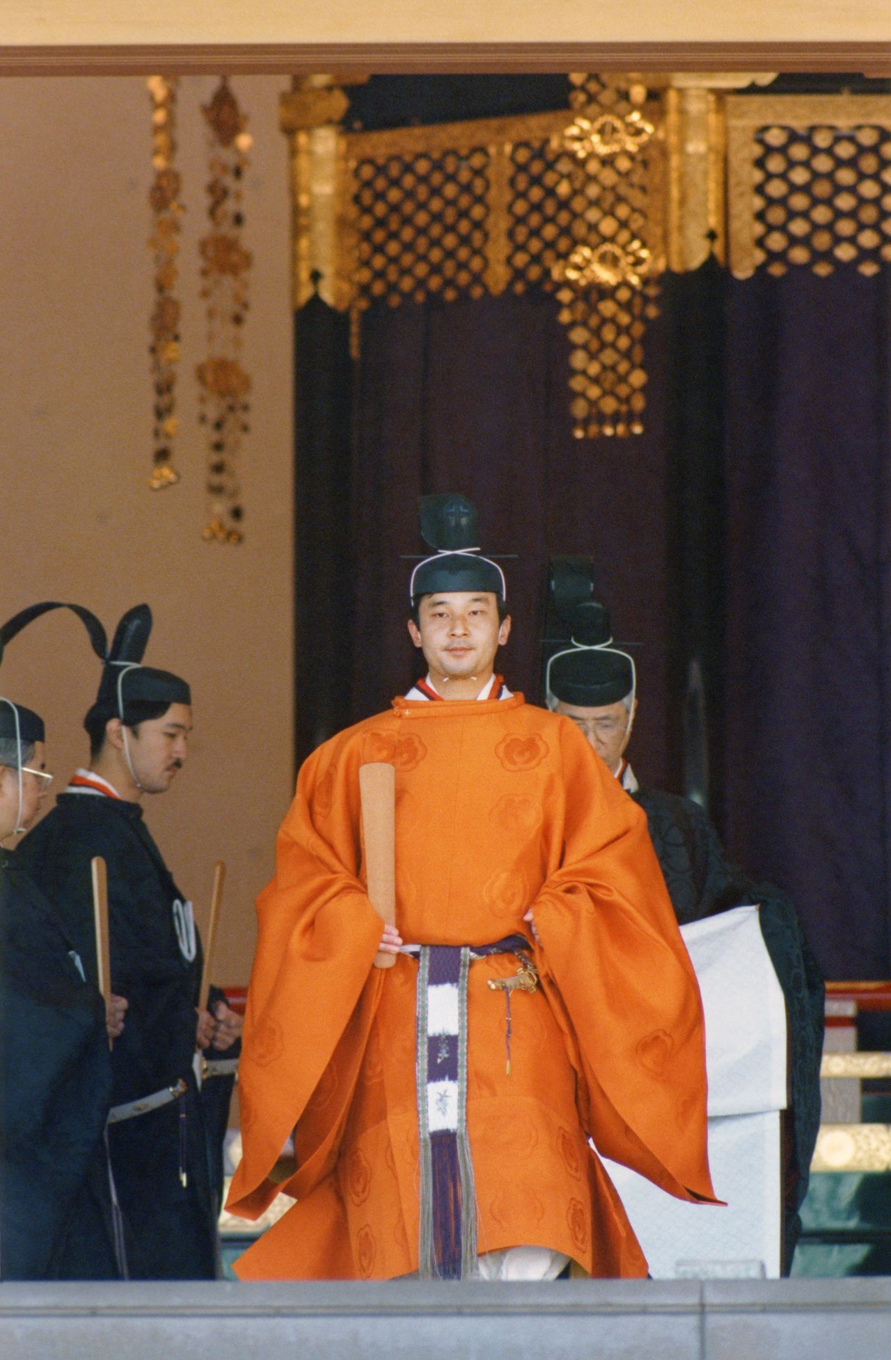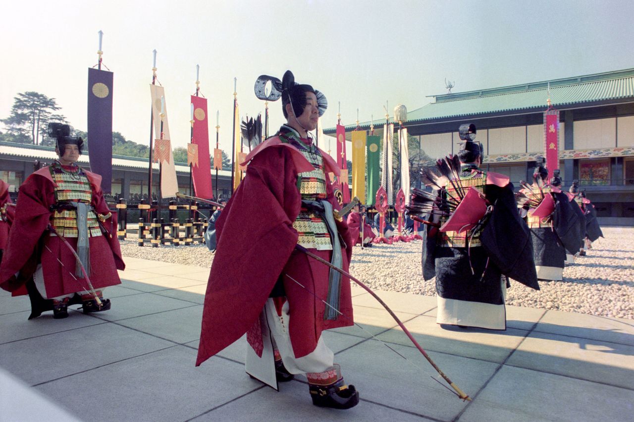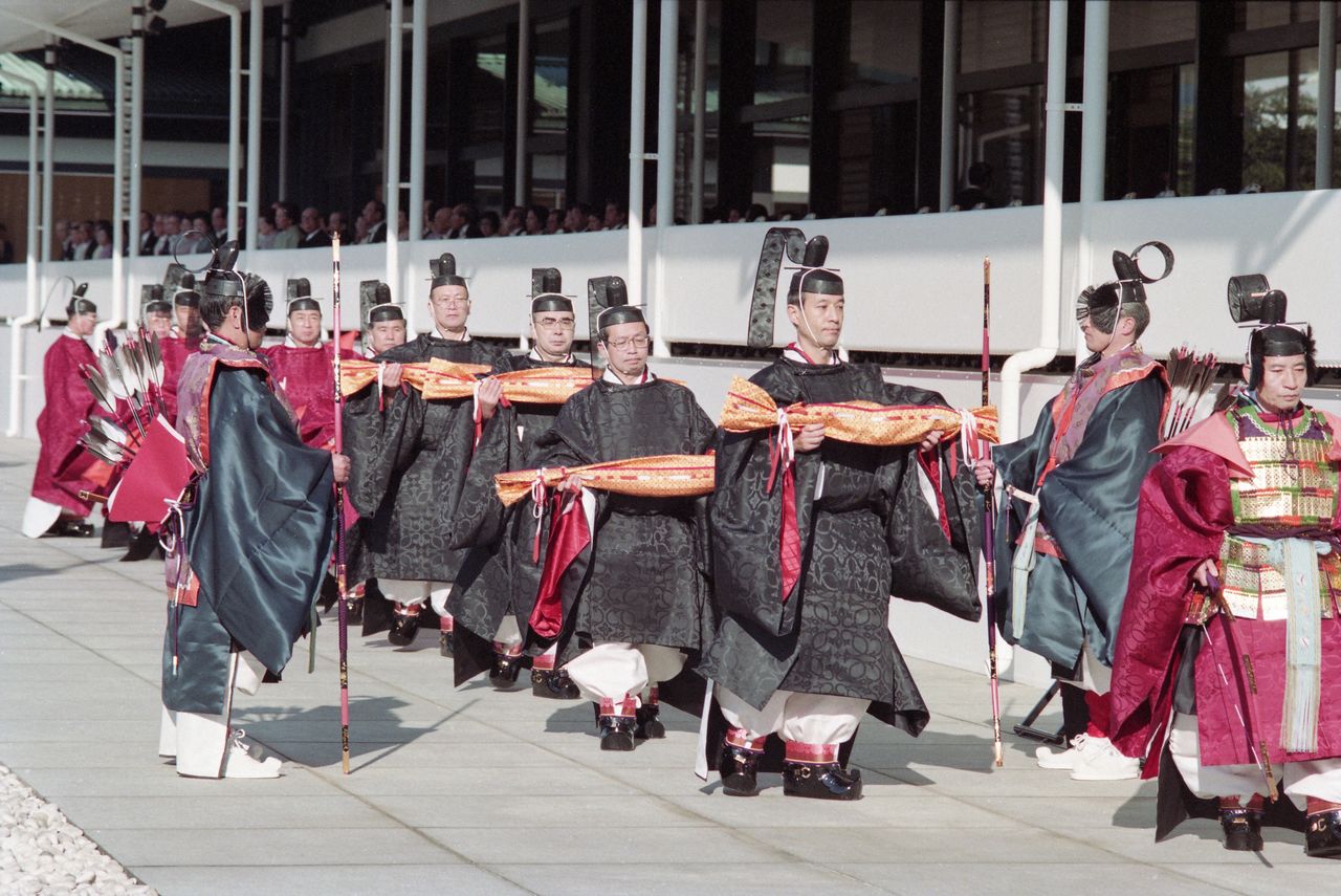 وأمام الرايات يصطف الرجال الذين يرتدون زيا تقليديا ويحملون ”الإيجيمونو (الأسلحة الحربية القديمة)“ مثل السيف الغليظ، والقوس، والدرع وغيرها، من أجل خلق جو مهيب للمراسم. ويقوم بذلك الدور الموظفون في وكالة البلاط الإمبراطوري.