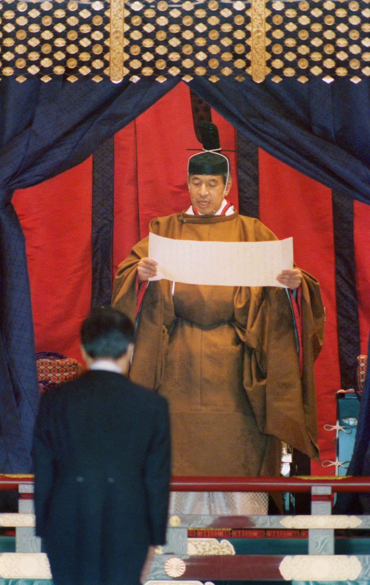 سيقف جميع المشاركين عند سماعهم إشارة الجرس في الحديقة الداخلية للقصر الإميراطوري، وسيتم فتح ستار عرشي تاكاميكورا وميتشوداي. وسيقوم المشاركون بأداء التحية عند سماع صوت الطبل. وعند تقدم رئيس الوزراء آبي إلى أمام العرش تاكاميكورا، سيقوم الإمبراطور بألقاء كلمة.