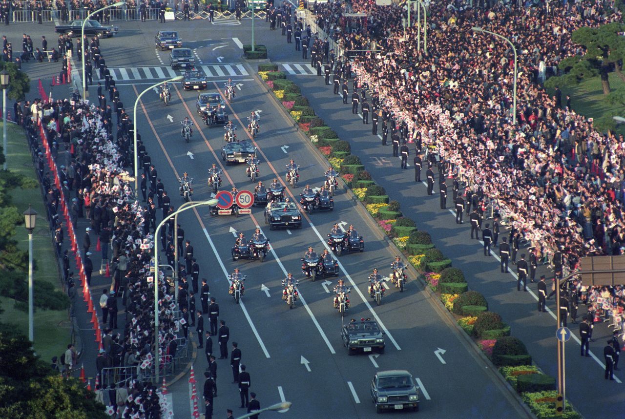 ”مراسم أداء الصلوات أمام معبد كاشيكودوكورو في يوم مراسم التنصيب“ للإمبراطور الأب أكيهتو في 12 نوفمبر/ تشرين الثاني 1990، الصورة من صحيفة يوميؤري.