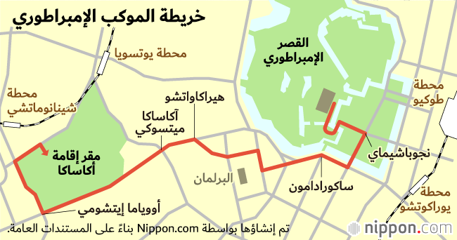 والسيارة المفتوحة هي من صنع شركة تويوتا في هذه المرة، ويبلغ طولها 5.34 أمتار، وعرضها 1.93 متر، وأك سيارة رولزرويس التي تم استخدامها في المرة السابقة بقليل. وسينطلق رتل السيارات بعد عزف النشيد الوطني من الموقف الجنوبي للقصر الإمبراطوري. وسيسير الموكب الإمبراطوري في المسار المحدد له من أمام البوابة الرئيسية للقصر الإمبراطوري – تقاطع ساكورادامون – البوابة الرئيسية لمبنى البرلمان – أمام مكتبة البرلمان – تقاطع هيراكاواتشو – أمام البوابة الجنوبية للأرض الإمبراطورية في أكاساكا – تقاطع أوياماإتشومي – البوابة الرئيسية للقصر الإمراطوري في أكاساكا. ومن المخطط أن يصل إلى القصر الإمبراطوري في أكاساكا في حوالي الساعة الثالثة والنصف عصرا، وبعد وصوله سيتم عزف النشيد الوطني مرة أخرى.
