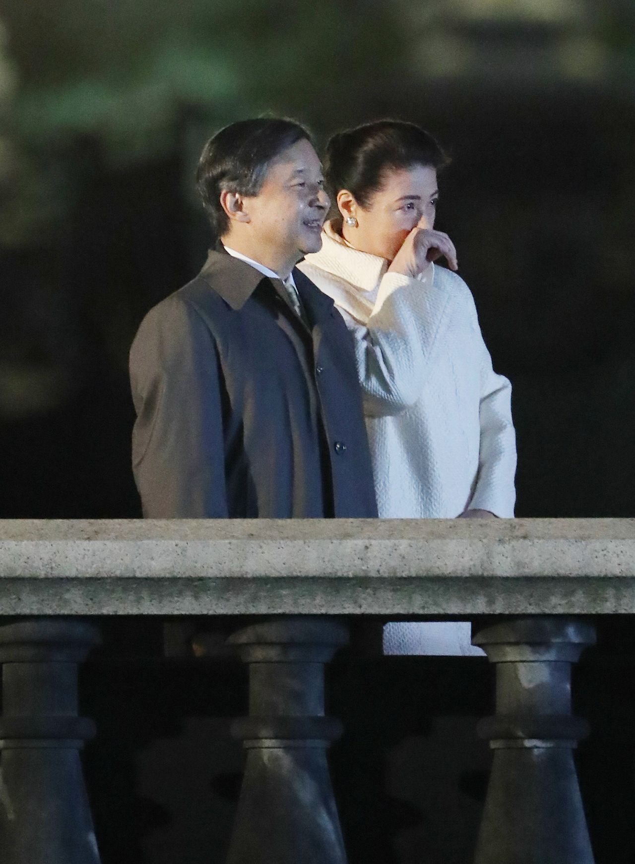 الإمبراطور ناروهيتو والإمبراطورة ماساكو يشاهدان المهرجان الوطني من القصر الإمبراطوري في 9 نوفمبر/ تشرين الثاني 2019. الصورة من جيجي برس.
