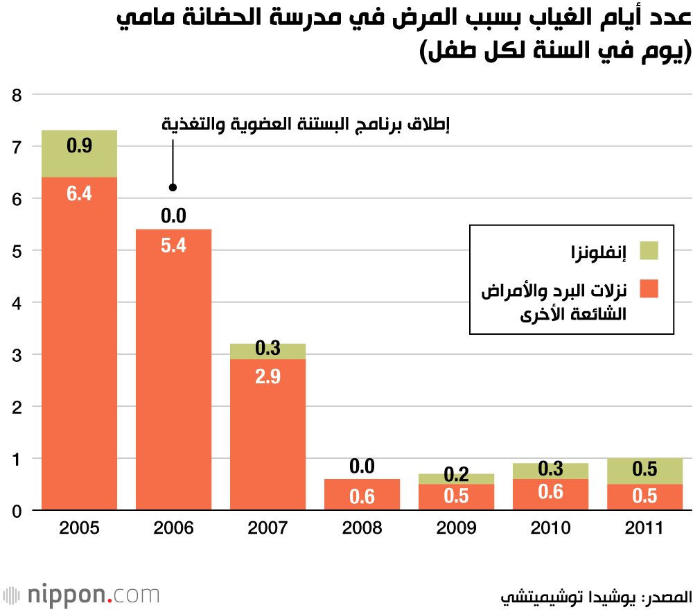 شرعت مدرسة الحضانة مامي في ساسيبو بمحافظة ناغاساكي في تبني مثل هذا البرنامج في عام 2006. بدأ المركز في زراعة الخضروات العضوية الخاصة به باستخدام السماد المخمر المصنوع من نفايات الطعام المعاد تدويرها. تتضمن وجبات الغداء المدرسية الخضروات، جنبا إلى جنب مع الأطعمة اليابانية المخمرة التقليدية مثل الميسو والمخللات. ويشارك الأطفال بنشاط في مهام إعادة التدوير والزراعة والتخليل وحتى صنع الميسو. وبعد عامين من تدشين البرنامج انخفض متوسط عدد حالات الغياب بسبب المرض من 5.4 يوم إلى 0.6 يوم في السنة.