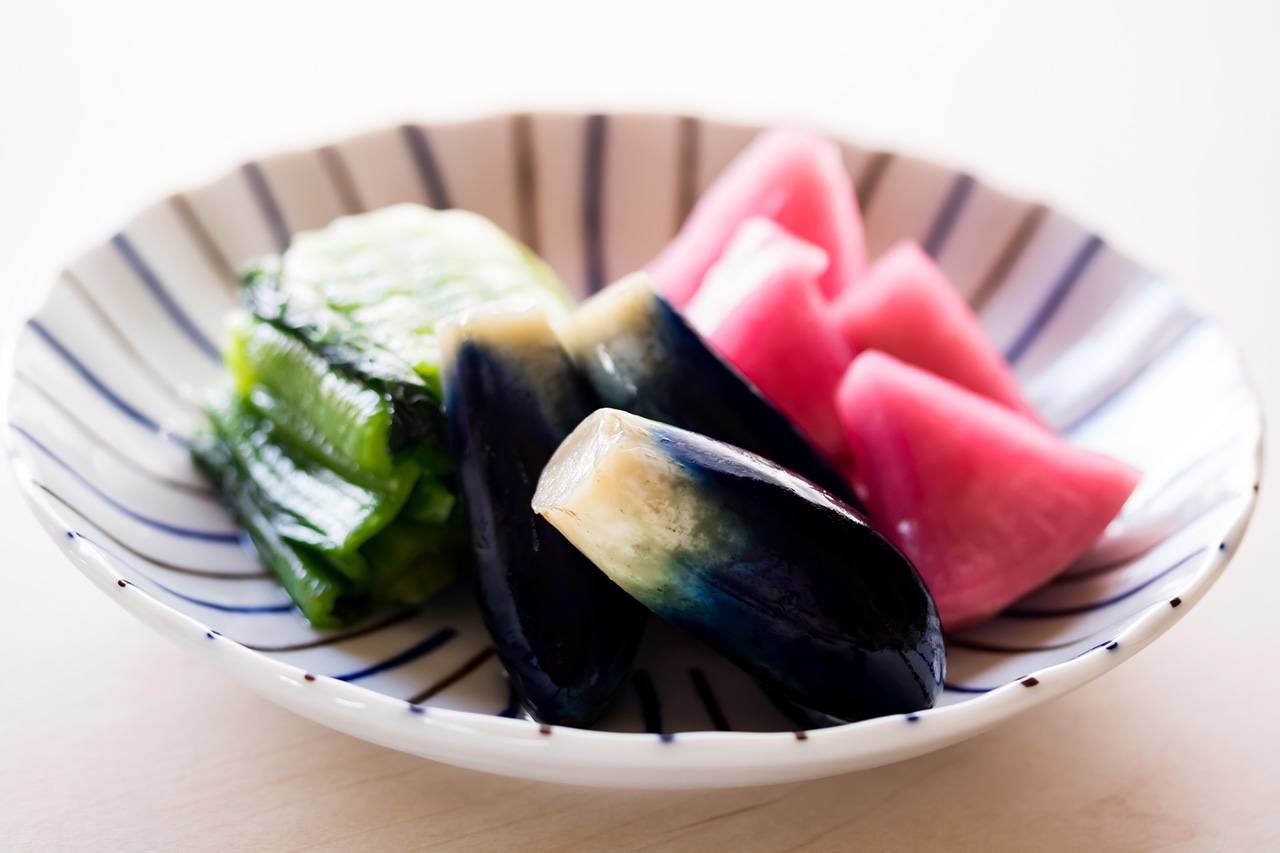 تشكيلة من مخللات ياماغاتا: من اليسار، ياماغاتا سيساي (الخردل الأخضر)، الباذنجان، واللفت الأحمر. الصورة من بيكستا.