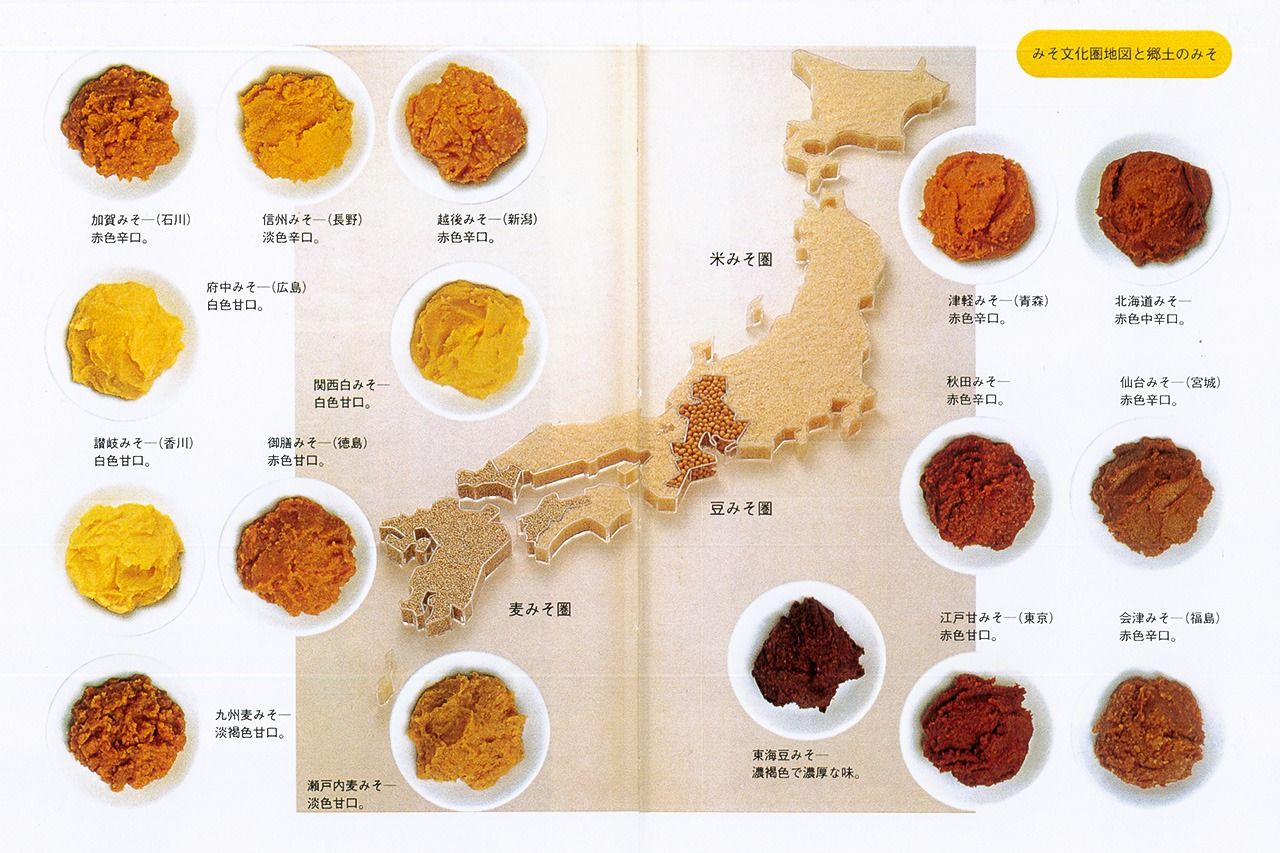 أصناف الميسو المنتجة في مختلف أنحاء اليابان. الصورة من إهداء كويزومي تاكيئو.