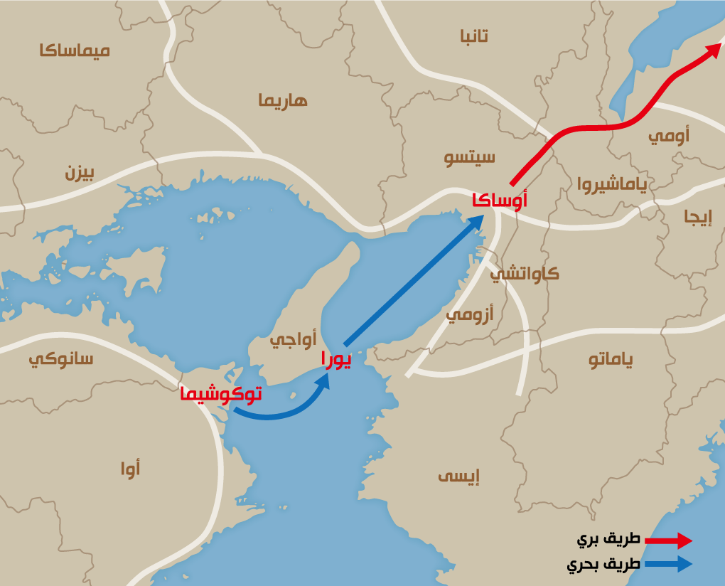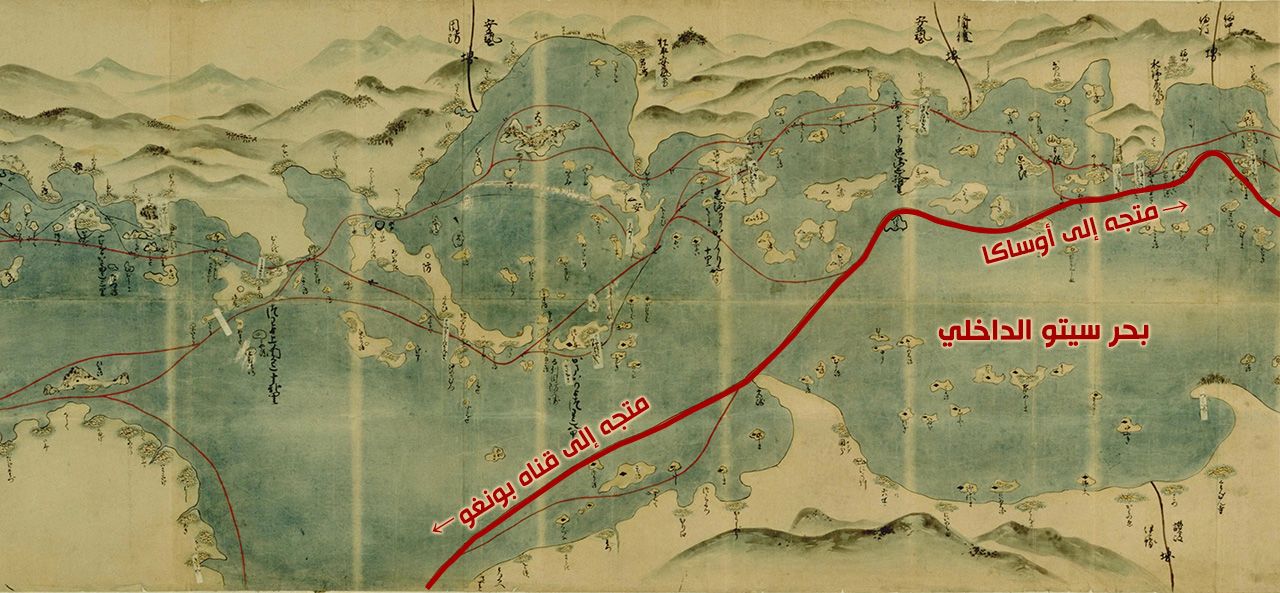 وبعد مغادرة تسوروساكي، يمر الأسطول عبر قناة بونغو ويدخل بحر سيتو الداخلي. وفي بحر سيتو الداخلي، كان يبحر متبعًا ”خريطة المسارات البحرية لطريق سايكوكو سوجي“ (خريطة لمسارات السفن تم رسمها في النصف الأول من فترة إيدو)، ومن المحتمل أنه كان يتجه شرقًا على طول مسار الخط السميك والوصل إلى أوساكا.