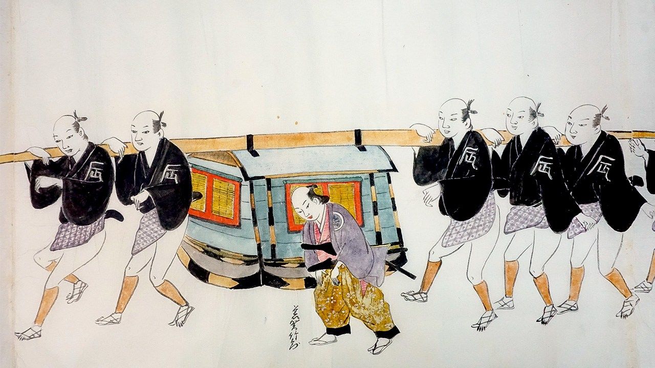 صورة العنوان الرئيسي: ”لوحة زيارة السيد نايؤنين إلى كيوتو“. يشير اسم نايؤنين إلى الحاكم الرابع لمقاطعة شوناي ساكاي تادازاني. وتصور اللوحة موكب الدايميو عندما ذهب إلى كيوتو بصفته مبعوثًا (نائب الشوغون) في عام 1725. تادازاني موجود في الحمَّالة ويسير نائبه بجانبه. (محفوظات متحف تشيدو)