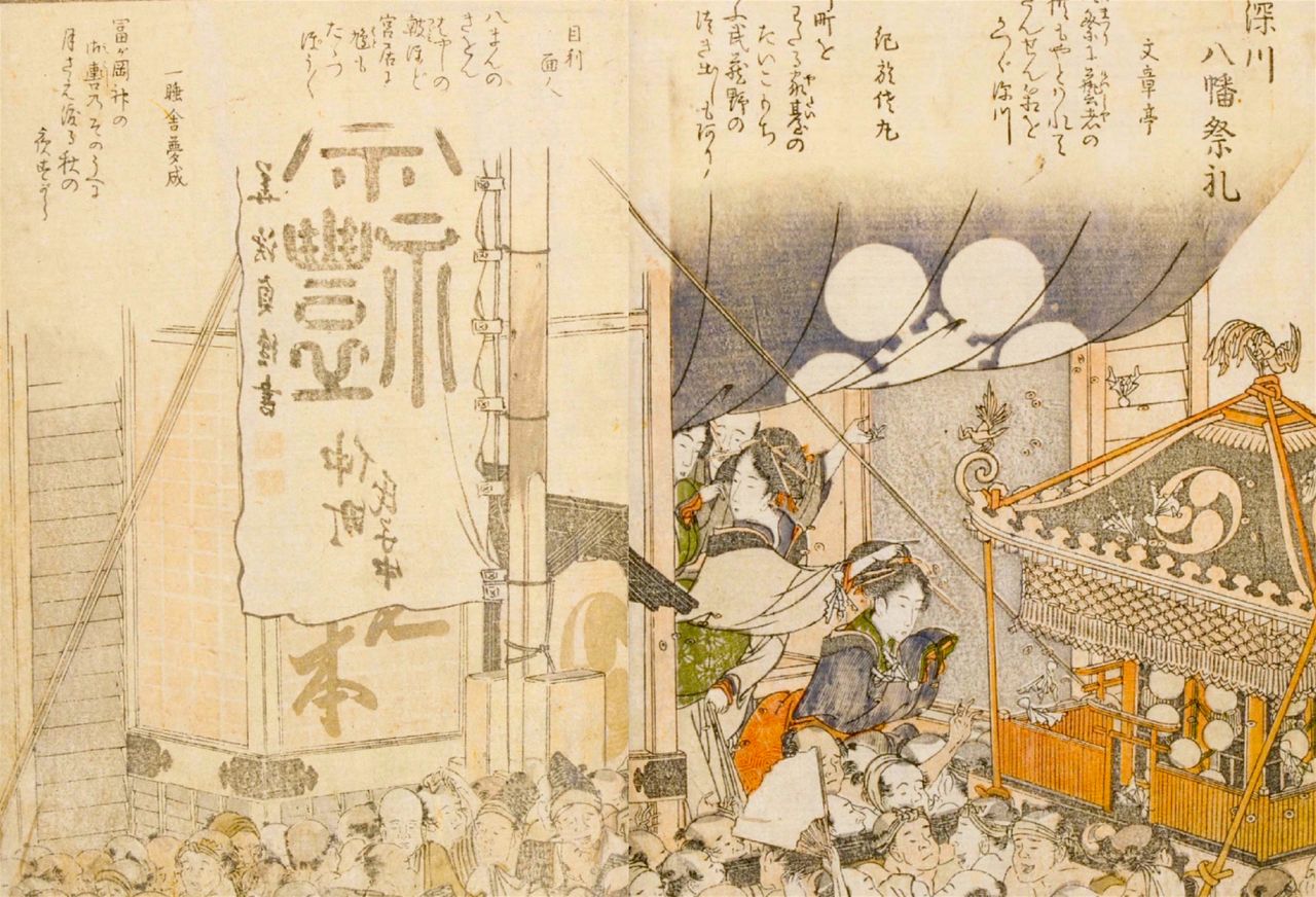 كان منتصف أغسطس/آب تقليديا هو الوقت الذي تقيم فيه معابد هاتشيمان الشينتوية في جميع أنحاء اليابان مهرجاناتها السنوية. وفي مدينة إيدو، كان الاحتفال يتم في معبد توميؤكا هاتشيمان في فوكاغاوا وكان يُعد أحد أكبر 3 مهرجانات في المدينة، إلى جانب مهرجاني كاندا وسانّو. وعلى خلاف مهرجان سانّو الذي كان مرتبطا بنظام حكم توكوغاوا، كان مهرجان توميؤكا (فوكاغاوا) مهرجانا لسكان ”شيتاماتشي (المدينة السفلى)“ القريبة من ضفاف نهر سوميدا.