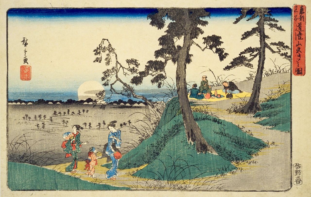 صورة للقمر في أوج اكتماله بينما يصعد في سماء دوكانياما، في حين تقوم أم وطفلها بجمع حشرات الخريف من ”أماكن شهيرة في العاصمة الشرقية“ للفنان أوتاغاوا هيروشيغي (بإذن من مكتبة البرلمان القومية).