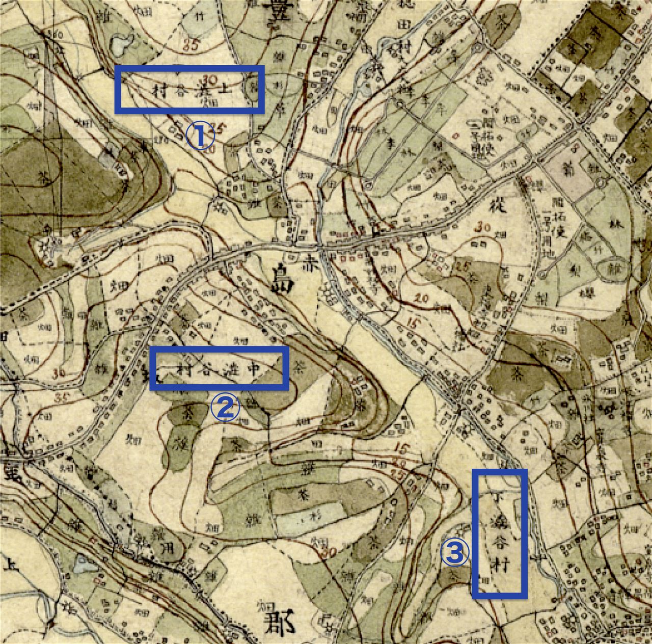 خريطة لمنطقة شيبويا في أوائل عصر ميجي، ويظهر فيها أسماء القرى الثلاث: (1) قرية كامي شيبويا (شيبويا العليا)، (2) قرية ناكا شيبويا (شيبويا الوسطى)، (3) قرية شيمو شيبويا (شيبويا السفلى)، وسط الحقول الزراعية المحيطة بها. صورة منقولة من نظام الاطلاع على البيئة الزراعية التاريخية التابع للمعهد الوطني للبحوث الزراعية في اليابان