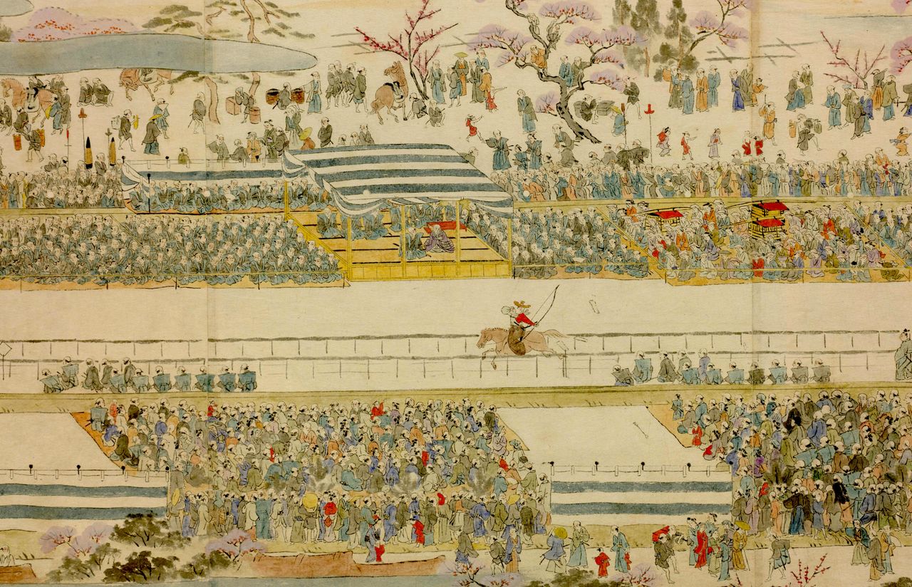 في لوحة ”رماية السهام على ظهر الخيل في تاكادانوبابا في السنة الثالثة من عصر غينبون (1738 م)“، يظهر جمع غفير من المتفرجين وهم يشاهدون طقس الرماية على ظهر الخيل (أرشيف مكتبة البرلمان الوطنية)