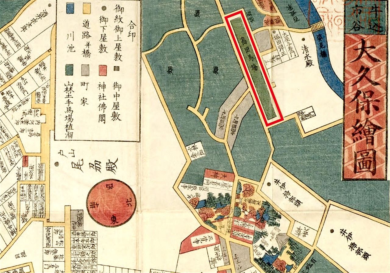 ”خرائط إيدو كيريئيزو: خريطة أوكوبو“ التي تم إعدادها بين عامي 1849 و1862. الجزء المستطيل داخل الإطار الأحمر يُمثّل منطقة تاكادانوبابا (أرشيف مكتبة البرلمان الوطنية)