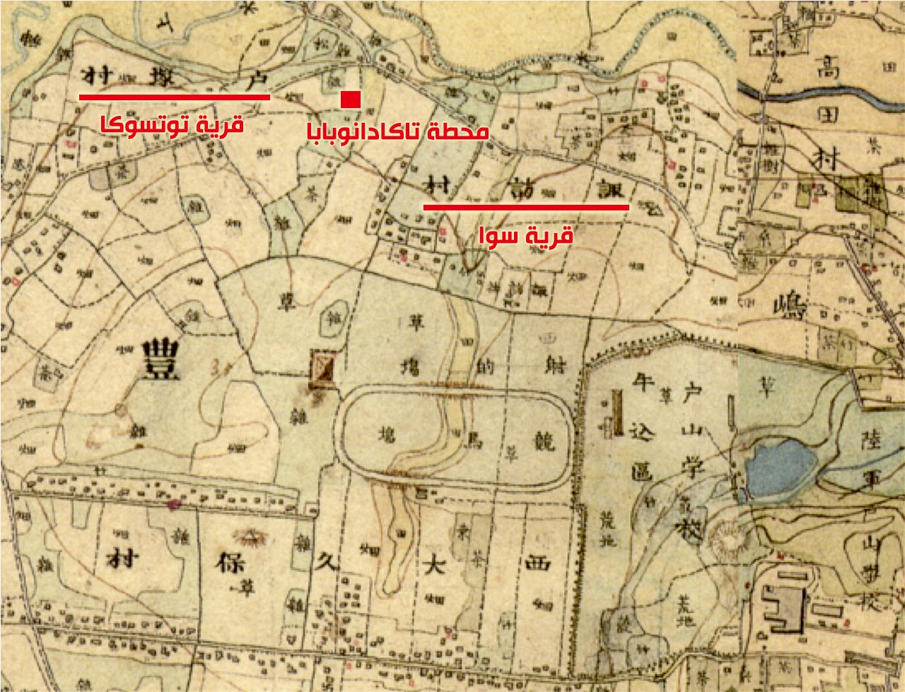 خريطة لمنطقة تاكادانوبابا في عصر ميجي. كانت أسماء المناطق القريبة من المحطة آنذاك هي ”قرية توتسوكا“ و”قرية سوا“. نقلًا عن نظام عرض البيئة الزراعية التاريخية في منظمة البحوث الزراعية والغذائية.