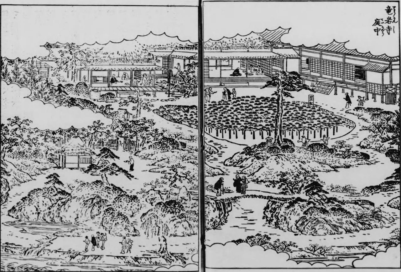 الصورة حديقة هذا المعبد كما وردت في كتاب ”دليل معالم إيدو“ الذي نُشر في النصف الأول من القرن التاسع عشر. (أرشيف مكتبة البرلمان الوطنية)