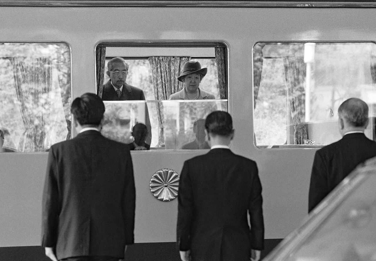 جلالة الإمبراطور والإمبراطورة يغادران محطة هاراجوكو متوجهين إلى مقر الإقامة الإمبراطوري في سوساكي في مدينة شيمودا بمحافظة شيزوكا من أجل قضاء فترة استجمام. (التصوير بتاريخ 10 مارس/آذار 1977، © جيجي برس)