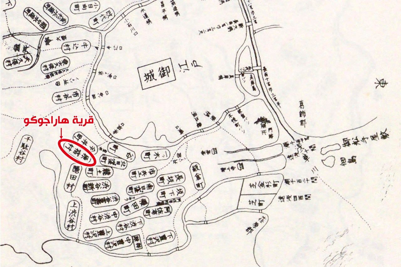 اسم قرية هاراجوكو يظهر في ”الخريطة المنقحة خلال عصر غينروكو“ (1688–1704)، وأسفلها توجد أيضًا قرية ”أوندين“. (أرشيف مكتبة البرلمان الوطنية)