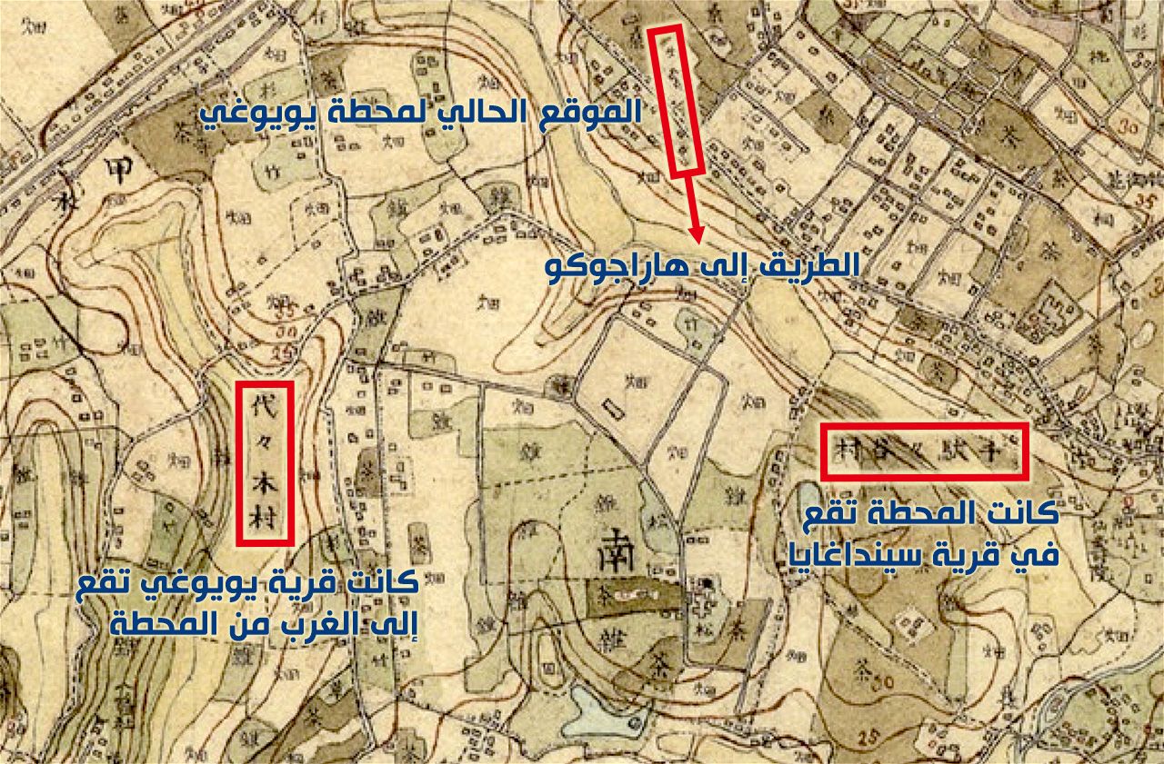 محطة يويوغي ومحيطها في أوائل عصر ميجي. كانت قرية يويوغي تقع على مسافة بعيدة عن المحطة. نقلًا عن خرائط نظام عرض البيئة الزراعية التاريخية