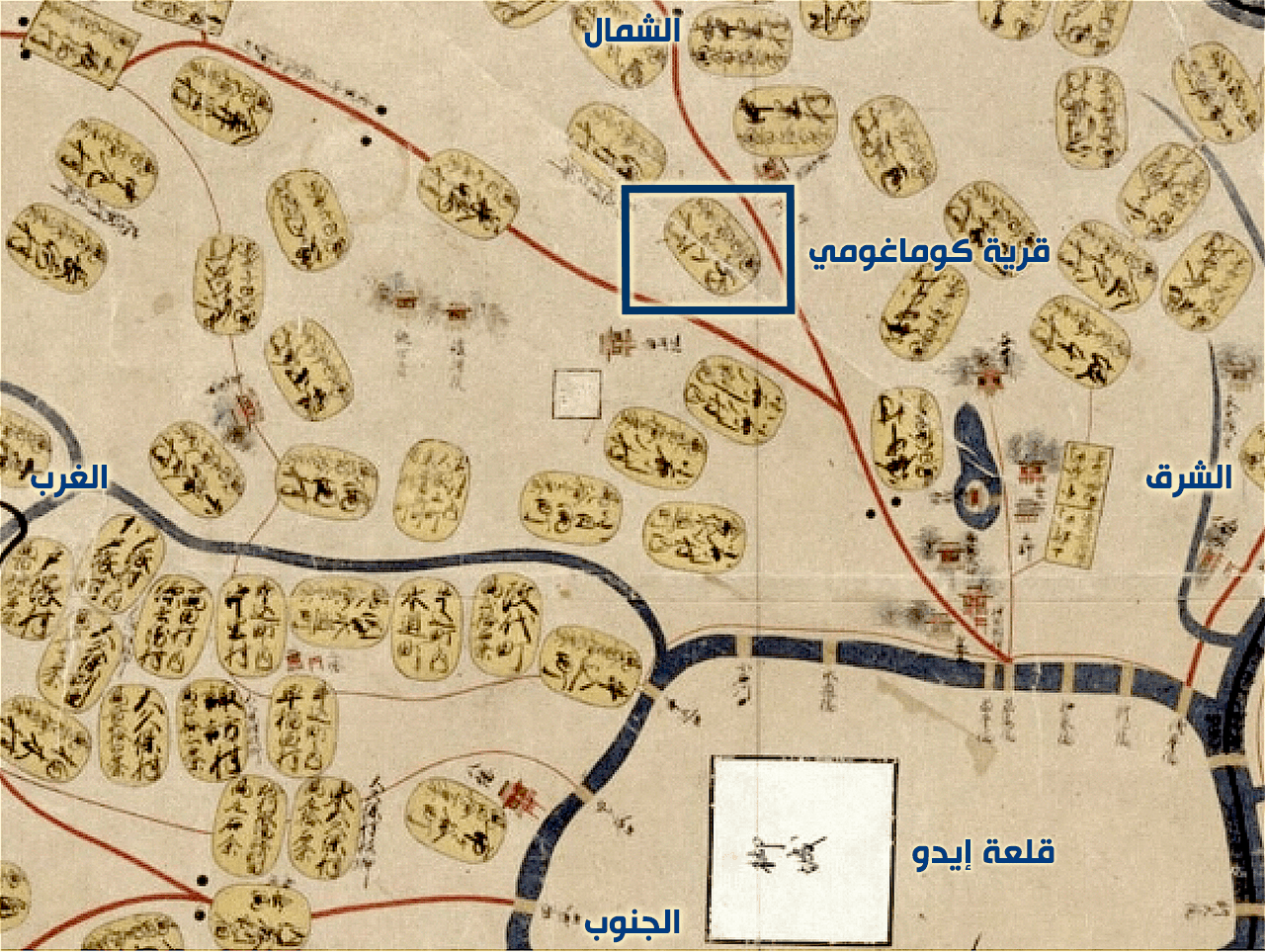 وتظهر تسمية ”قرية كوماغومي“ في جميع الخرائط الرسمية التي أمرت الحكومة الشوغونية بإعدادها خلال عصر إيدو، وهي ”خريطة مقاطعة شوهو“ (بدأ إعدادها نحو عام 1644)، و”خريطة مقاطعة غينروكو“ (تم إعدادها بين عامي 1696 و1702)، و”خريطة مقاطعة تينبو“ (تم إعدادها بين عامي 1835 و1838). وهذا يوضح أن الاسم كان قد ترسخ بالفعل كاسم للمكان بحلول القرن السابع عشر.