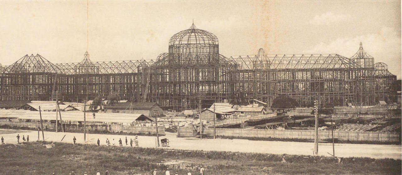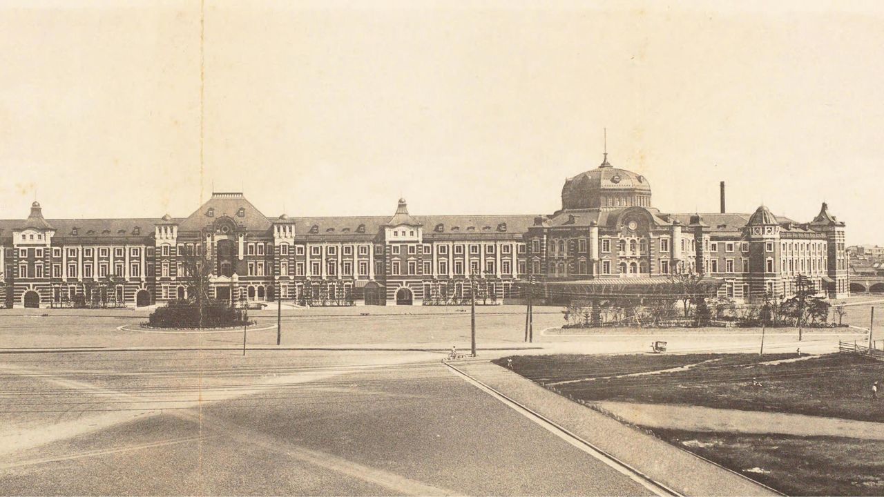 أول بناء لمحطة طوكيو أثناء فترة بنائها. تظهر في الصورة الهياكل الحديدية للقبتين. المصدر: ”الملخص المعماري لخطوط السكك الحديدية فوق الجسور المرتفعة في مدينة طوكيو“، أرشيف مكتبة البرلمان الوطنية