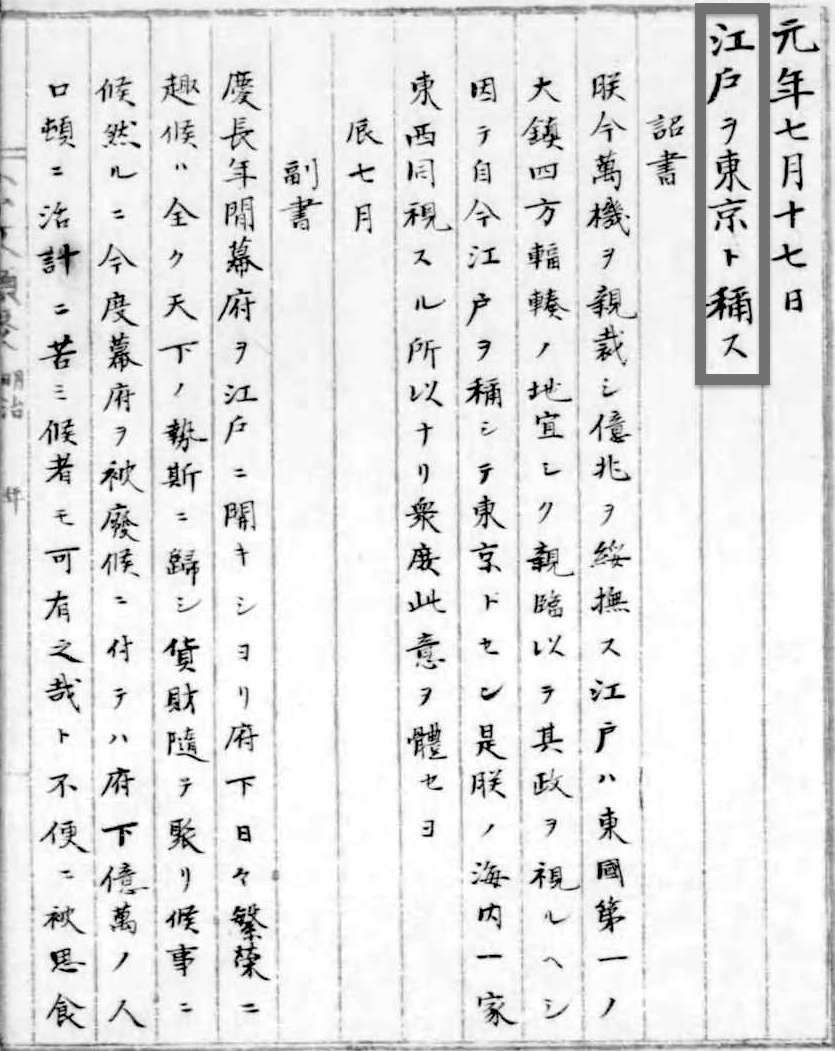 في السابع عشر من يوليو/تموز من عام 1868، أصدر الإمبراطور ميجي المرسوم الإمبراطوري التالي الذي غيّر اسم إيدو إلى طوكيو، وأعلنه للشعب.