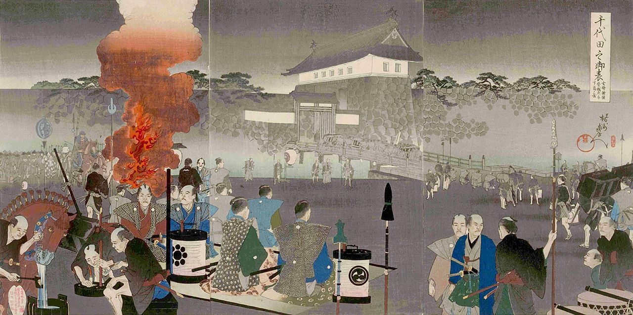 لوحة ”مقدمة تشيودا: ظهور الدايميو ونزولهم عن الخيول عند بوابة أوتيمون“ التي تصور بوابة أوتيمون في يوم الخنزير في شهر أكتوبر/تشرين الأول (يوم الخنزير الأول). المصدر: أرشيف قسم المجموعات الخاصة في مكتبة طوكيو المركزية