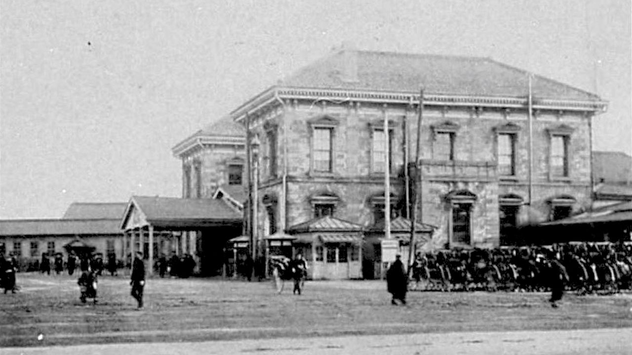(النص الأصلي باللغة اليابانية، صورة العنوان الرئيسي: محطة شينباشي الأولى التي كانت تُعرف باسم ”محطة شينباشي تيشاجو“. تم افتتاحها في الرابع عشر من شهر أكتوبر/تشرين الأول عام 1872. المصدر: ”ألبوم صور اليابان“، أرشيف مكتبة البرلمان الوطنية